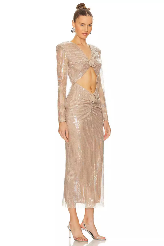 VİOLET VATKALI PAYETLİ MİDİ ELBİSE