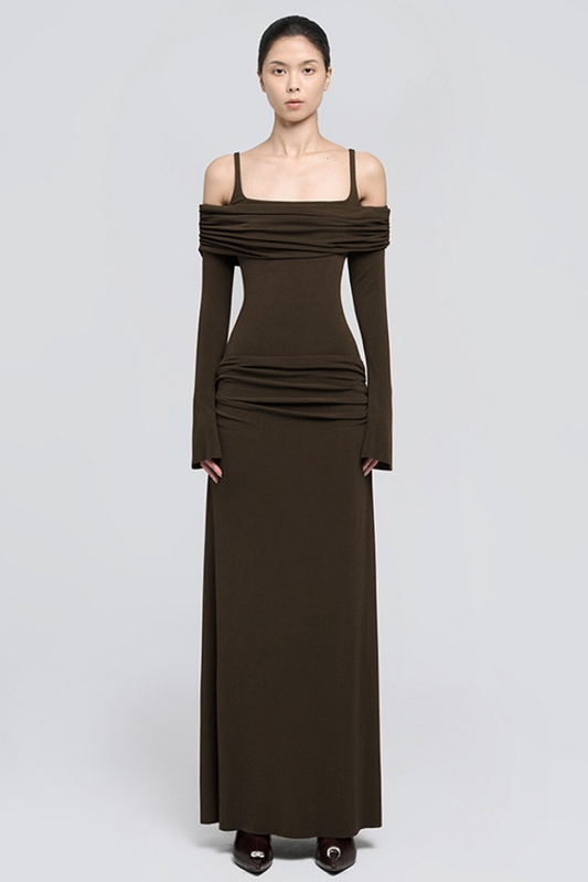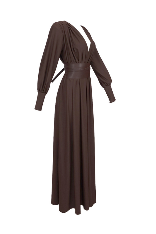 ZOEY DRAPELİ KAHVERENGİ UZUN ELBİSE