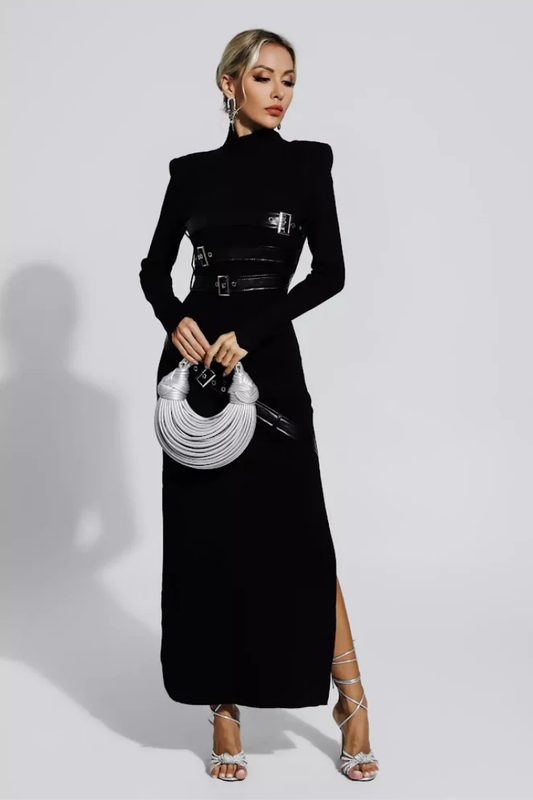 RUBY DERİ KEMERLİ VATKALI UZUN ELBİSE