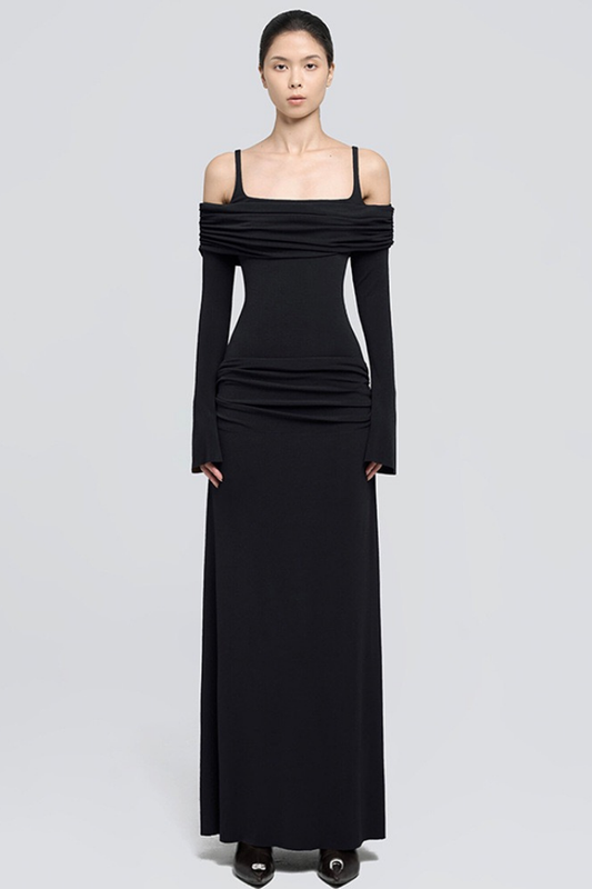 ZOEY DRAPELİ SİYAH UZUN ELBİSE