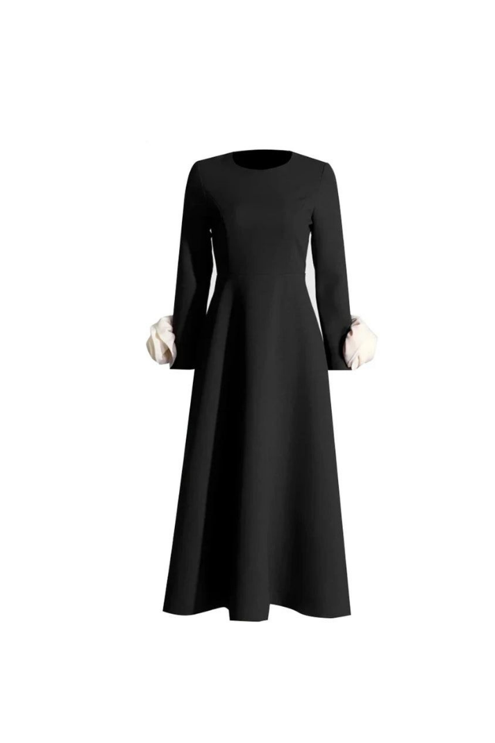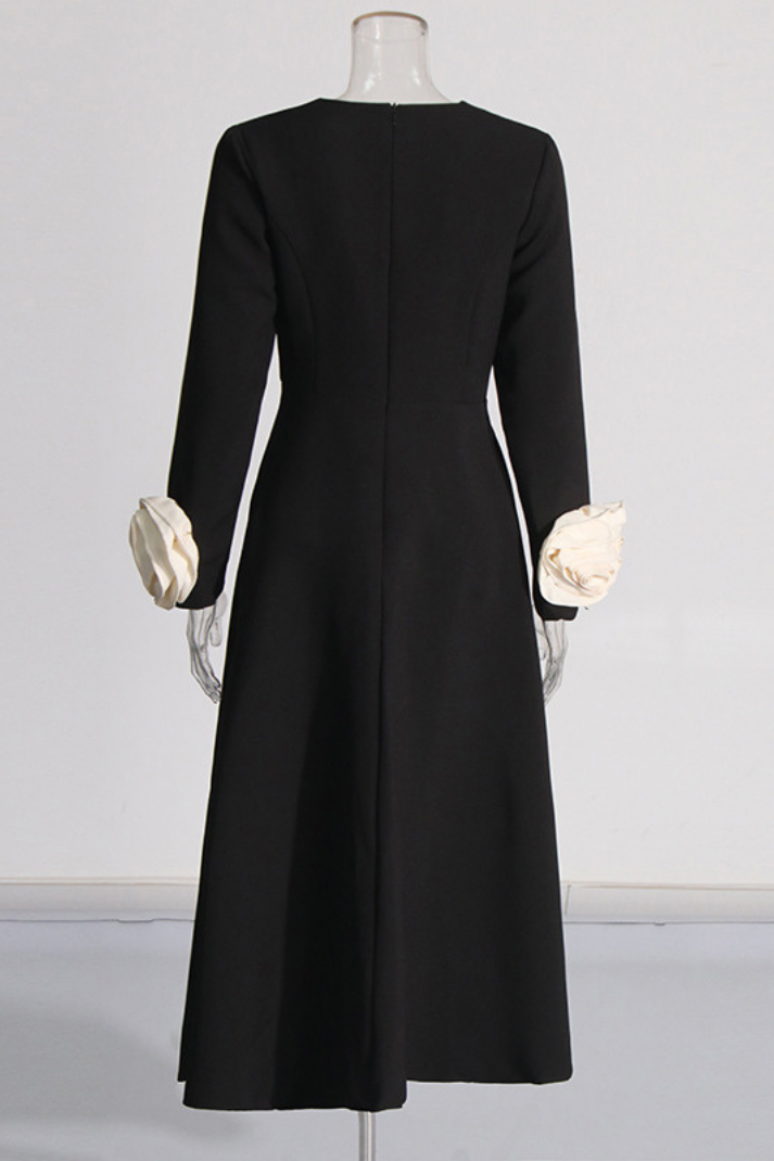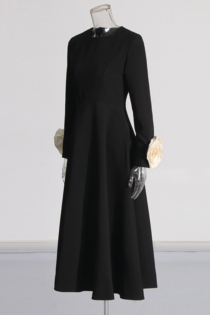 ADRİAN GÜL DETAYLI SİYAH MİDİ ELBİSE