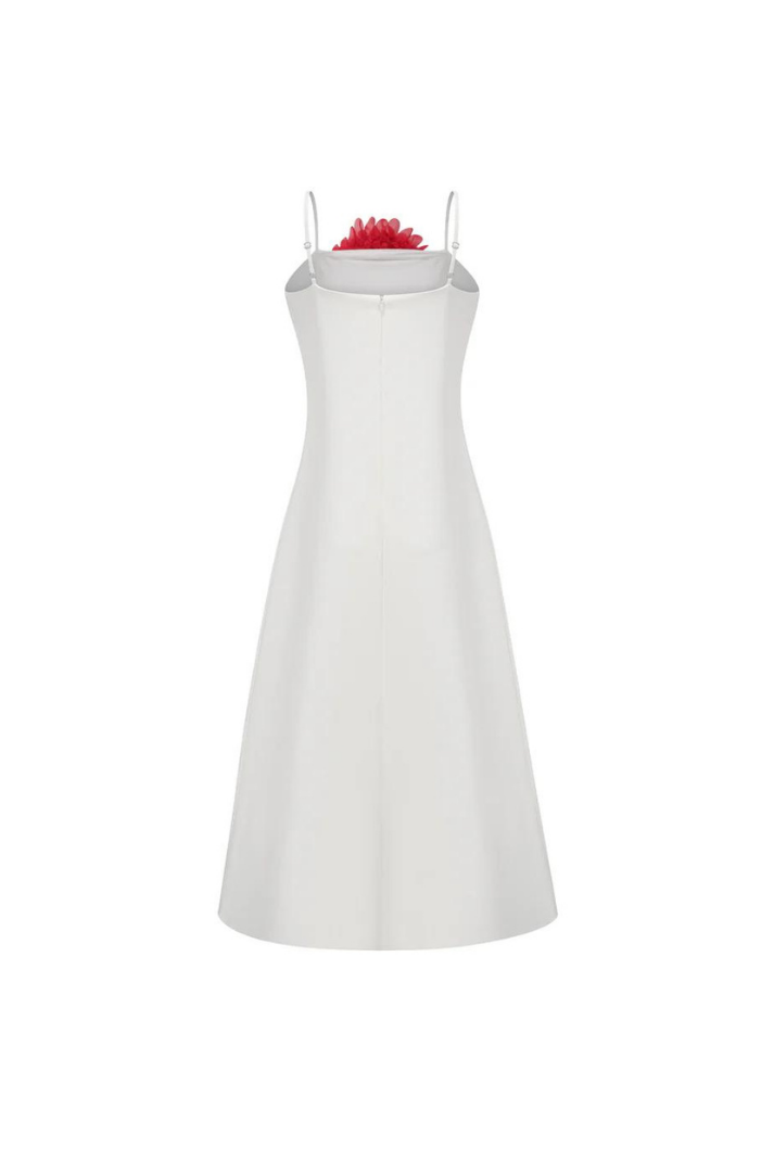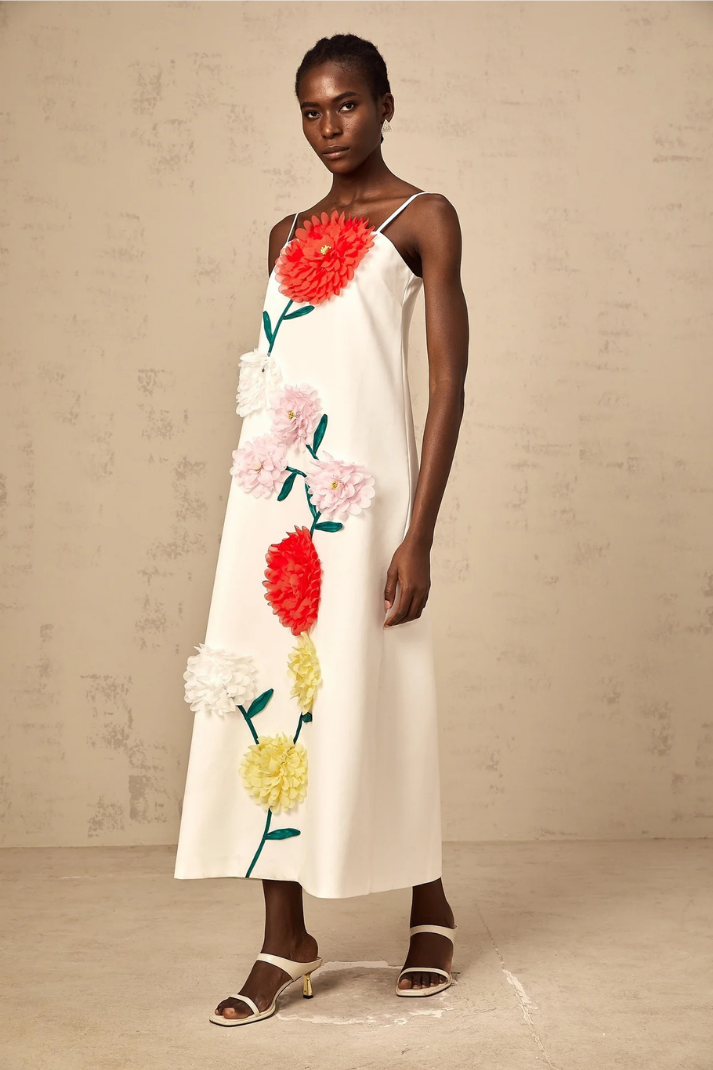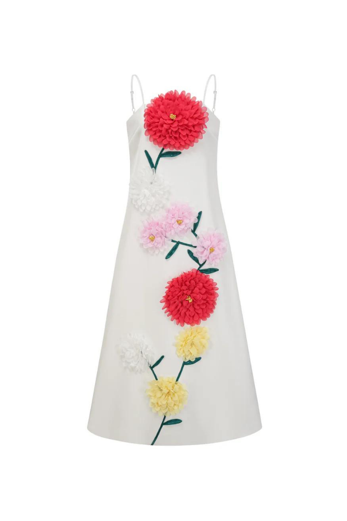 -Stil: 3D çiçek işlemeli askılı midi elbise