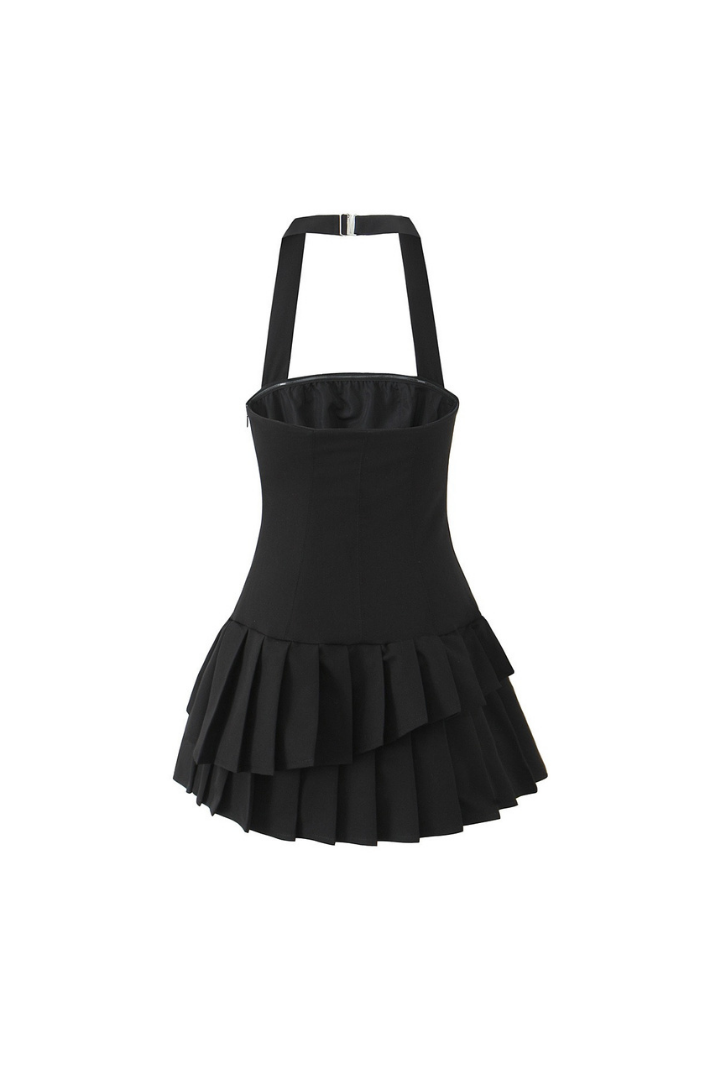 -Detaylar: Halter yaka, ensede ayarlanabilir kayış, pileli ve katmanlı etek, vücudu saran formda, gizli yan fermuar kapatma