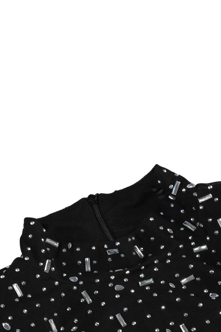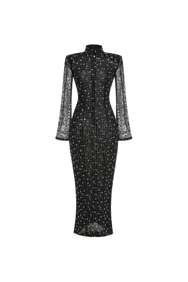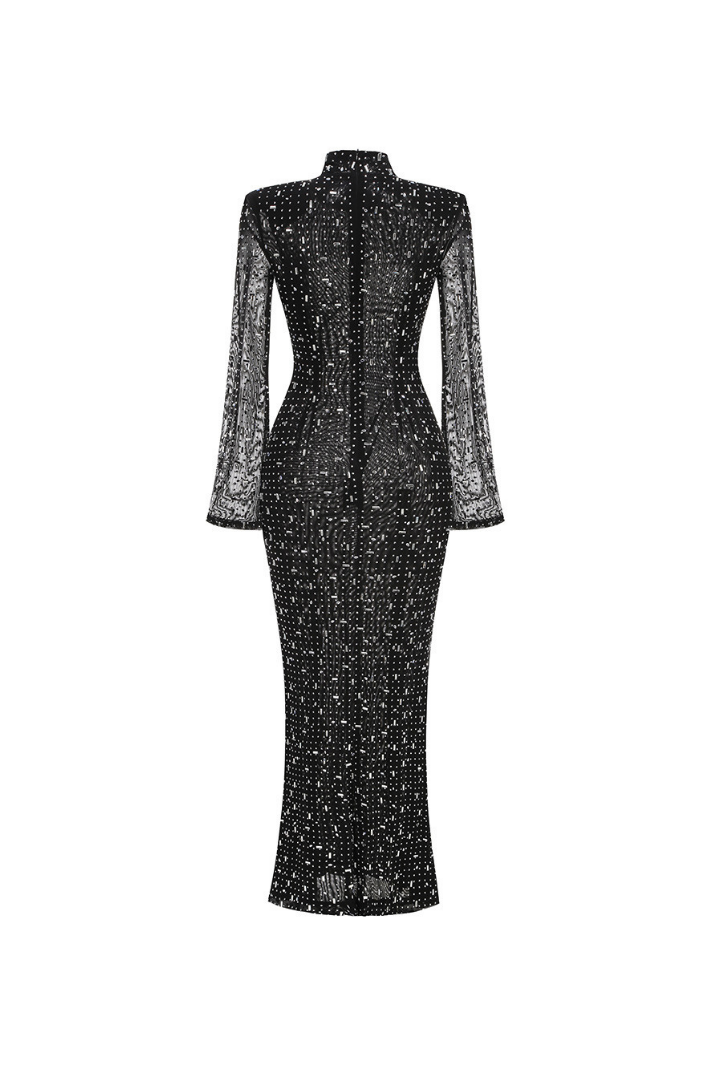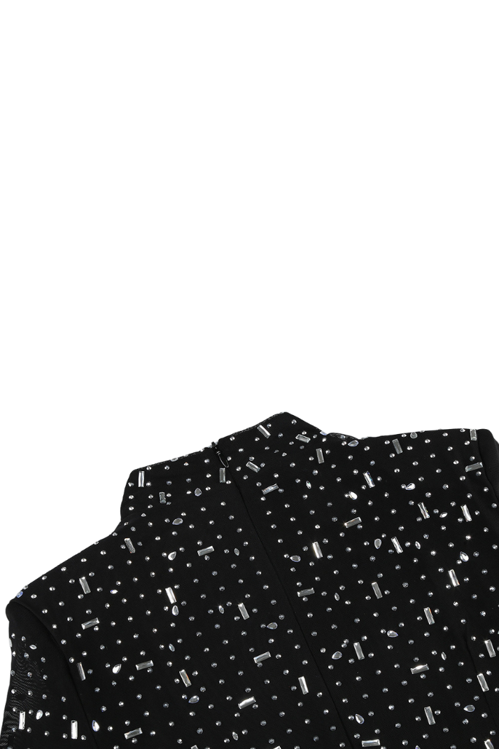 -Detaylar: Uzun ve transparan kollar, gümüş taş süslemeli, sahte boyun, streç formda, geniş manşetler, astarlı, arkada gizli fermuar kapatma