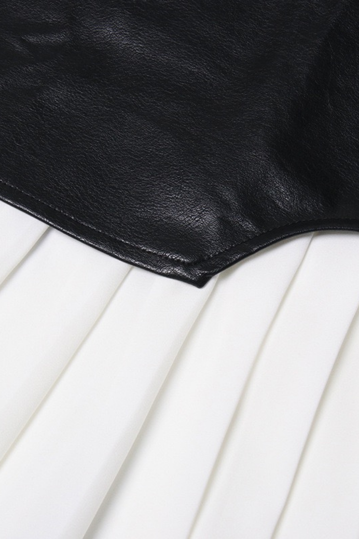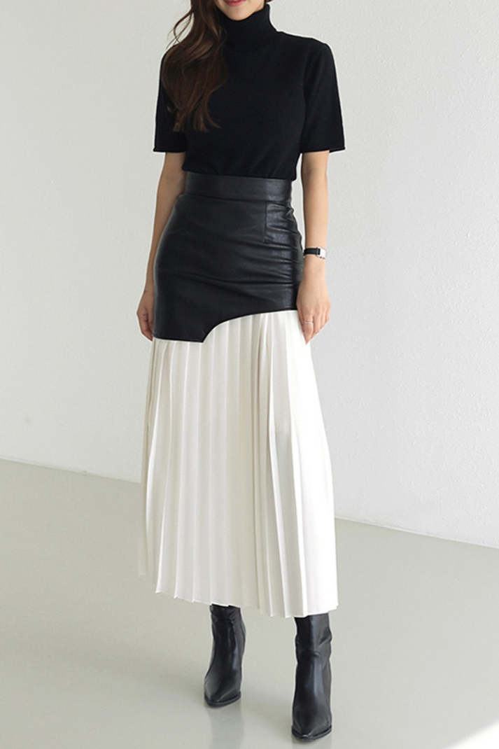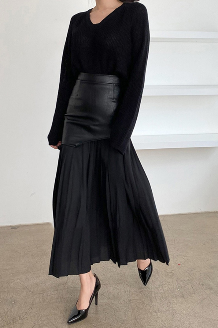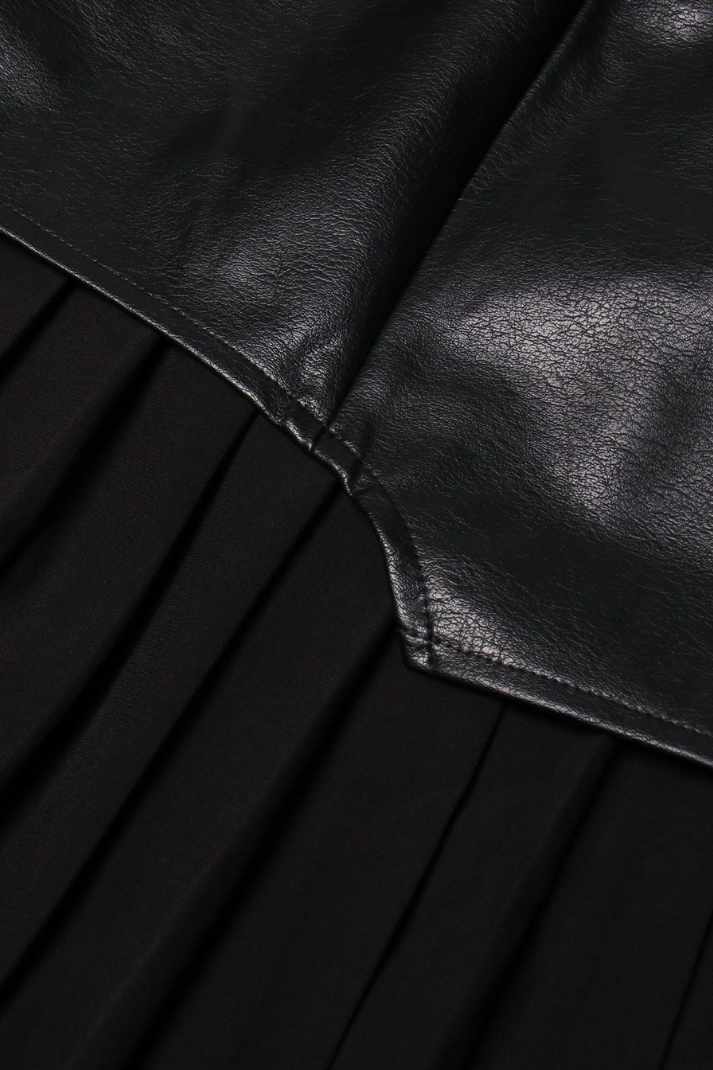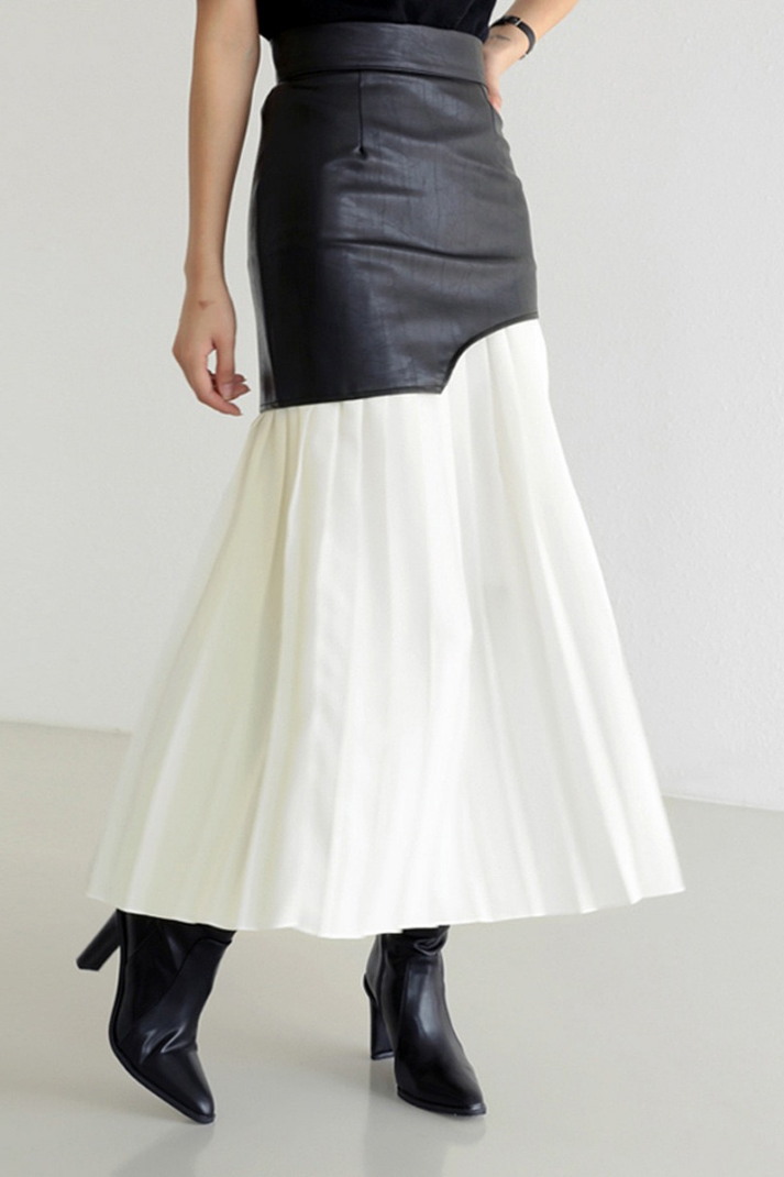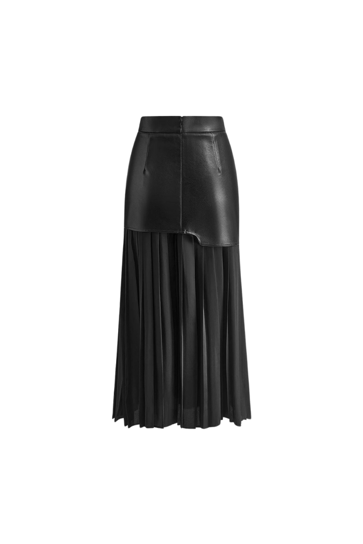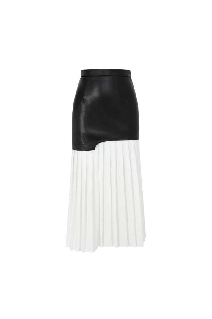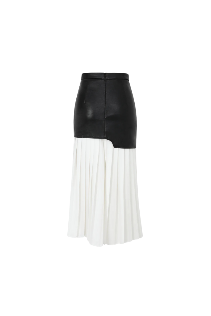 -Stil: Asimetrik suni deri ve kumaş karışımlı pileli midi boy etek