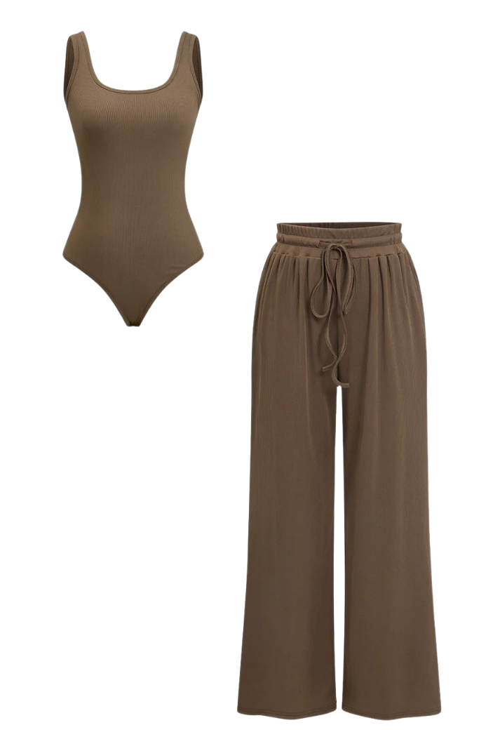 Fit bodysuit ve Pantolon Takım , modern tasarımı ve rahat yapısıyla öne çıkan bir kombin. Vücuda tam oturan ribanalı bodysuit, şık ve zarif bir görünüm sunarken, geniş paça ve yüksek bel pantolon, rahatlığı ön planda tutan dökümlü kesimiyle hareket özgürlüğü sağlar. Yumuşak ve esnek kumaşı sayesinde günlük giyimden şık davetlere kadar geniş bir kullanım alanı sunar.