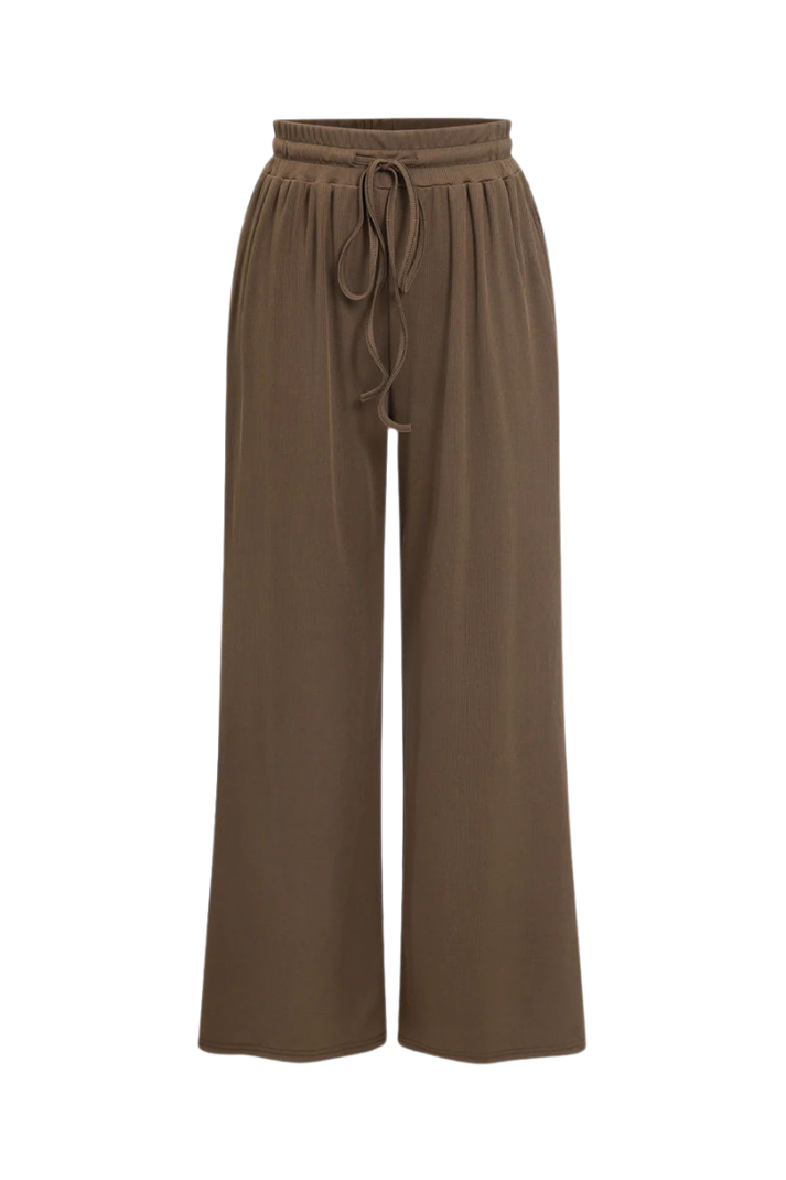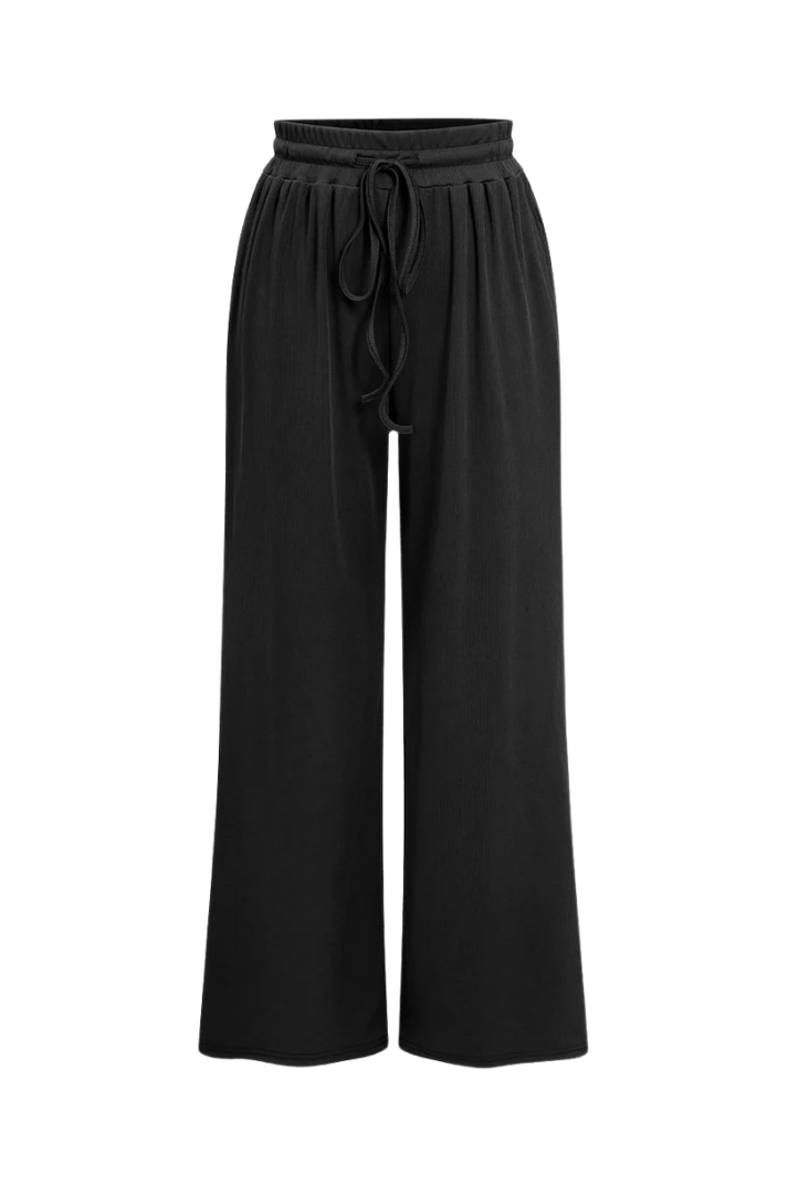 -Detaylar: Vücudu saran, U yaka bodysuit ve yüksel bel, bağcık detaylı geniş paça pantolon