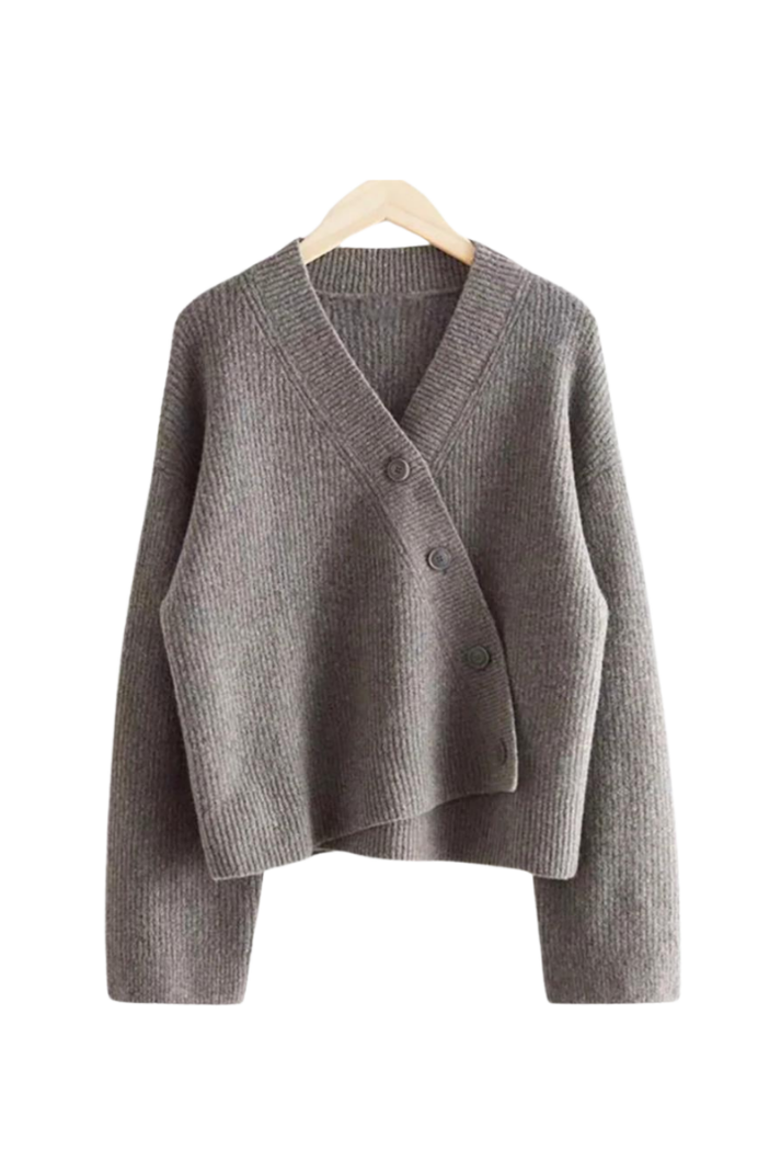 Judy Asimetrik Düğmeli Örgü Hırka, asimetrik düğmeli tasarımıyla sıradan hırkalardan farklı rahat ve şık. Hırka tam bir kış arkadaşınız olacak…