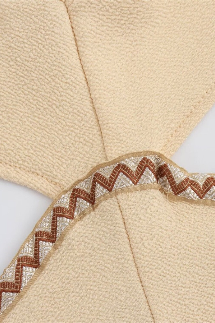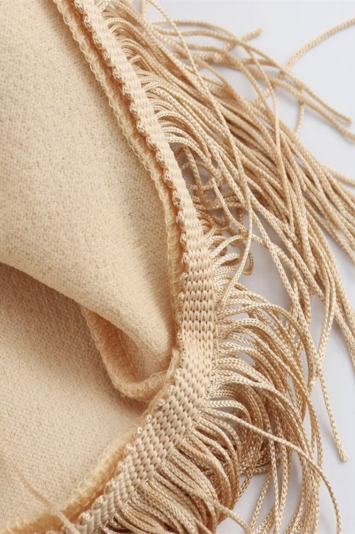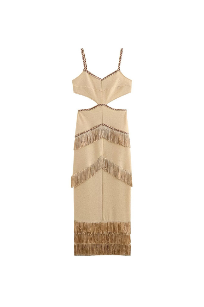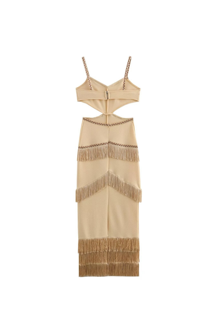 -Stil: Püsküllü, bel ve sırt dekolteli elbise