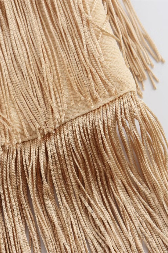 -Detaylar: Askılı, bandaj stili askılar, yüksek bel, arkada sırt ve belde fermuar kapama, düz inen etek formu, asimetrik püskül süsleme, bel ve sırt dekolteli