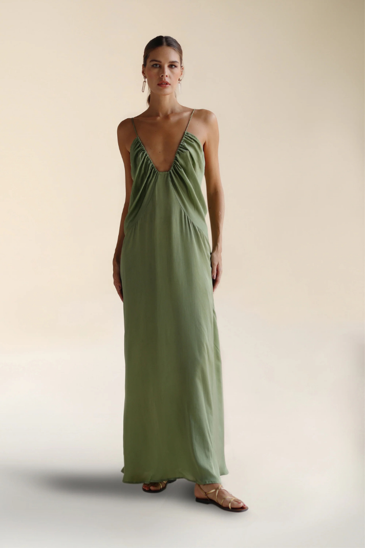 -Detaylar: Spagetti askılar, göğüste büzgülü form ve dekolte, sırtta dekolte, uzun etek formu
