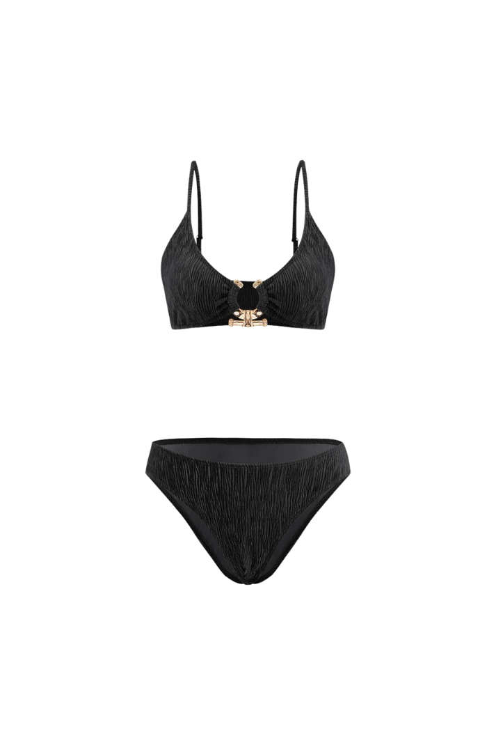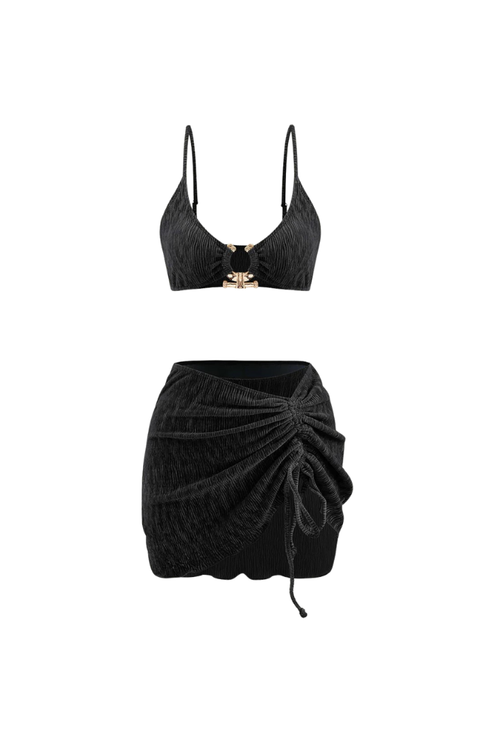 -Stil: Kadife dokulu metal aksesuarlı üç parça bikini seti