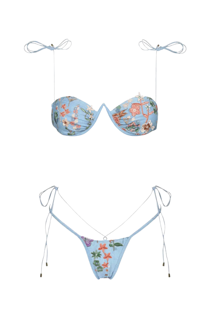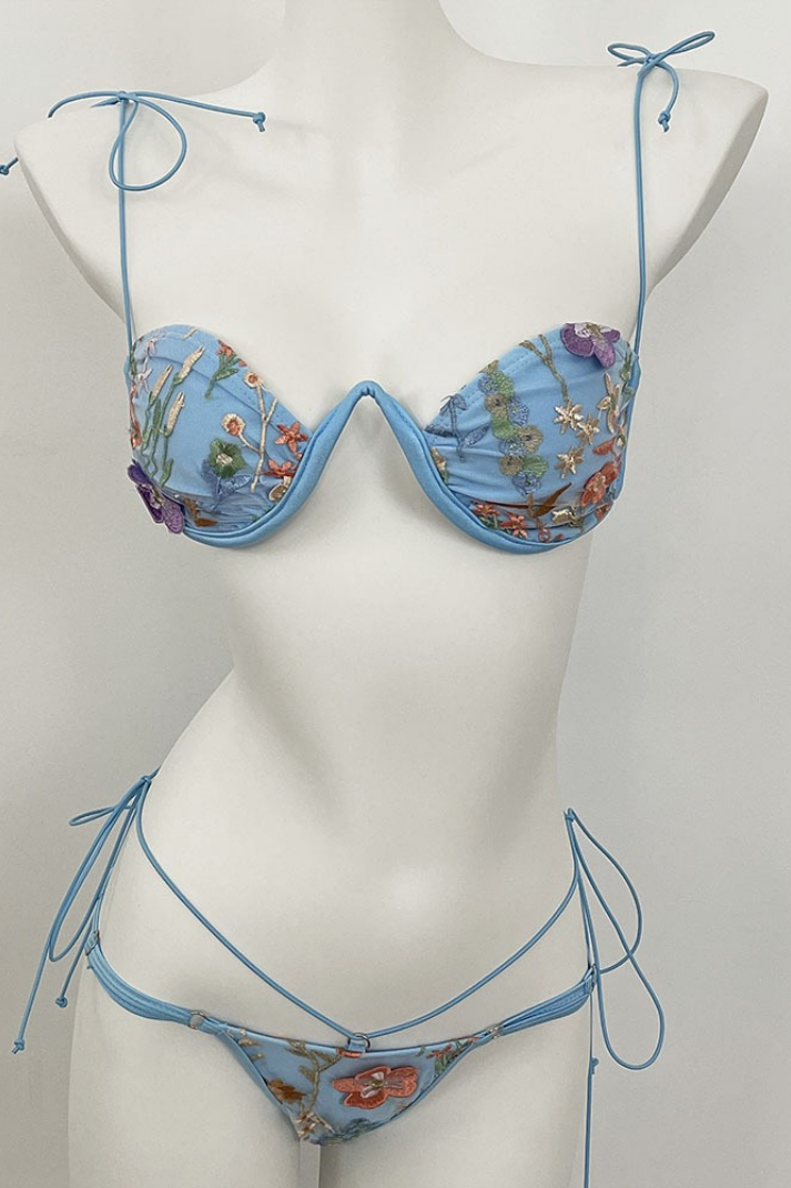 -Detaylar: Bikini Üst: Omuzdan bağlanabilir askılar, sırttan bağlanabilir ipli, metal destekli, çıkarılabilir göğüs pedleri, çiçek nakış işlemeler Bikini Alt: Kenarları ayarlanabilir ipli, arkası büzgülü, ekstra göbekten bağlanabilir bağcıklar, brazilian tanga formunda