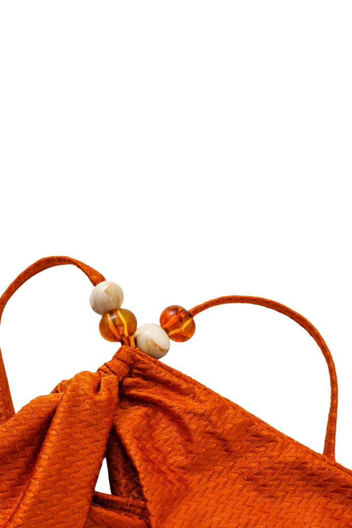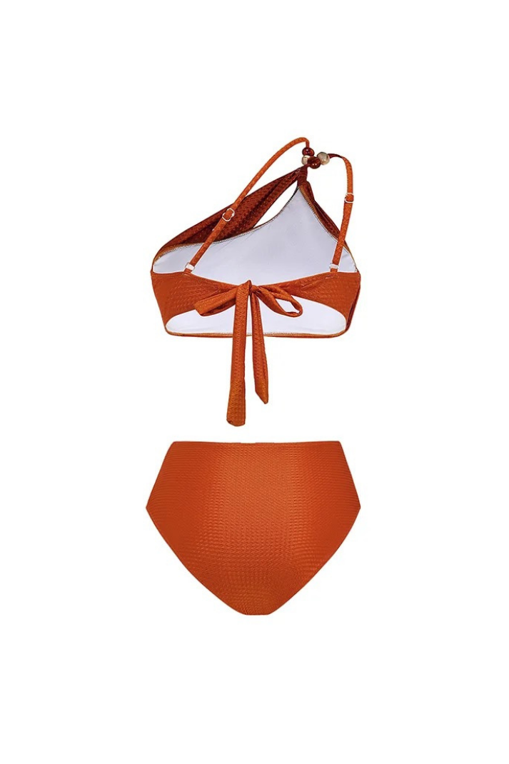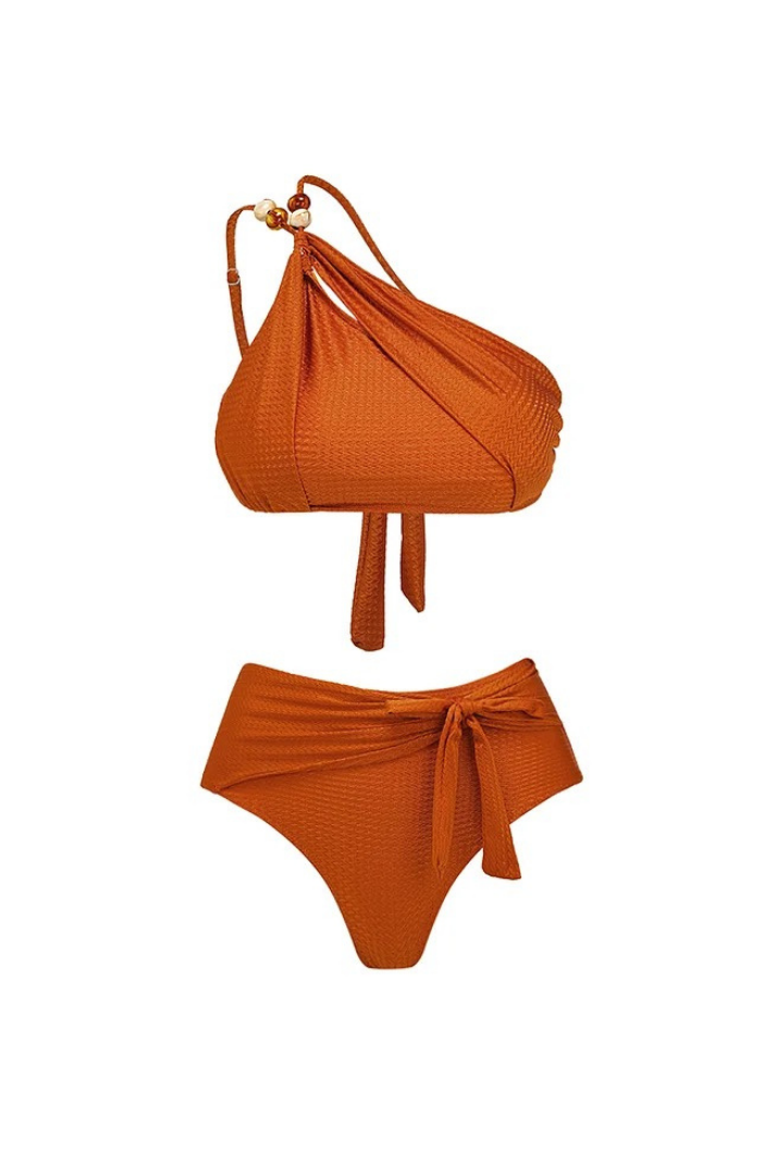 -Detaylar: Bikini Üst: Asimetrik tasarım, tek omuz, altın ve boncuk aksesuar detay, göğüs pedleri Bikini Altı: Yüksek bel, düğümlü bağlama detayı Pareo: Bağlama detay, hafif transparan