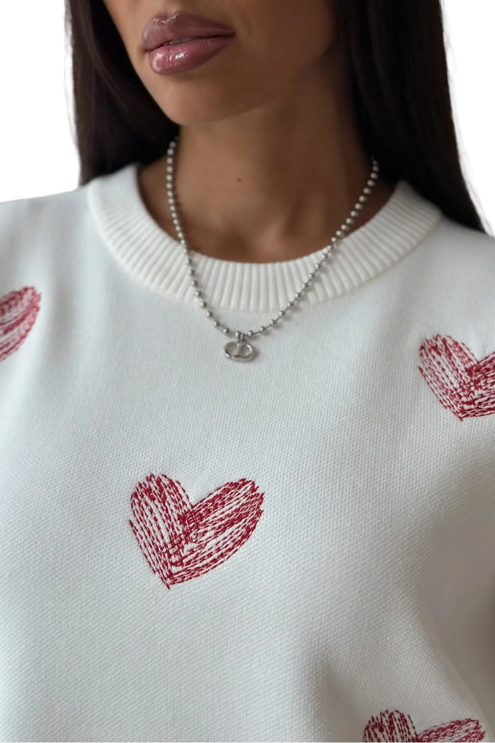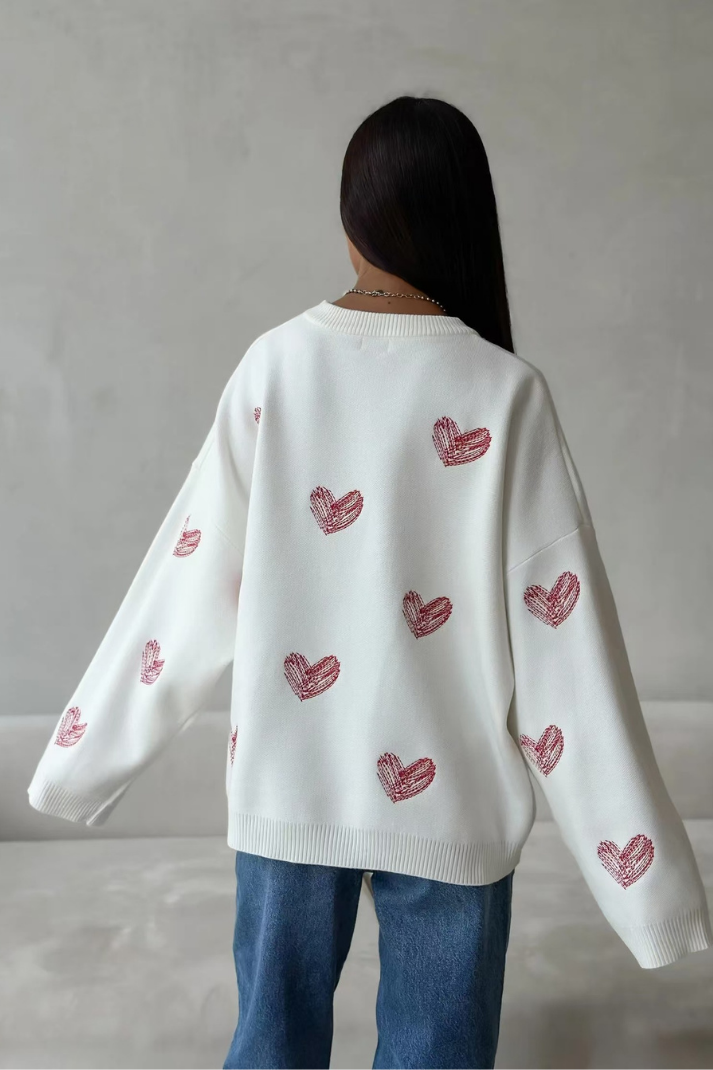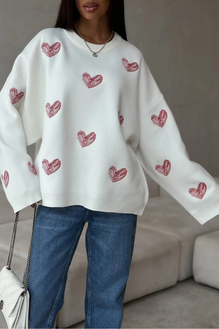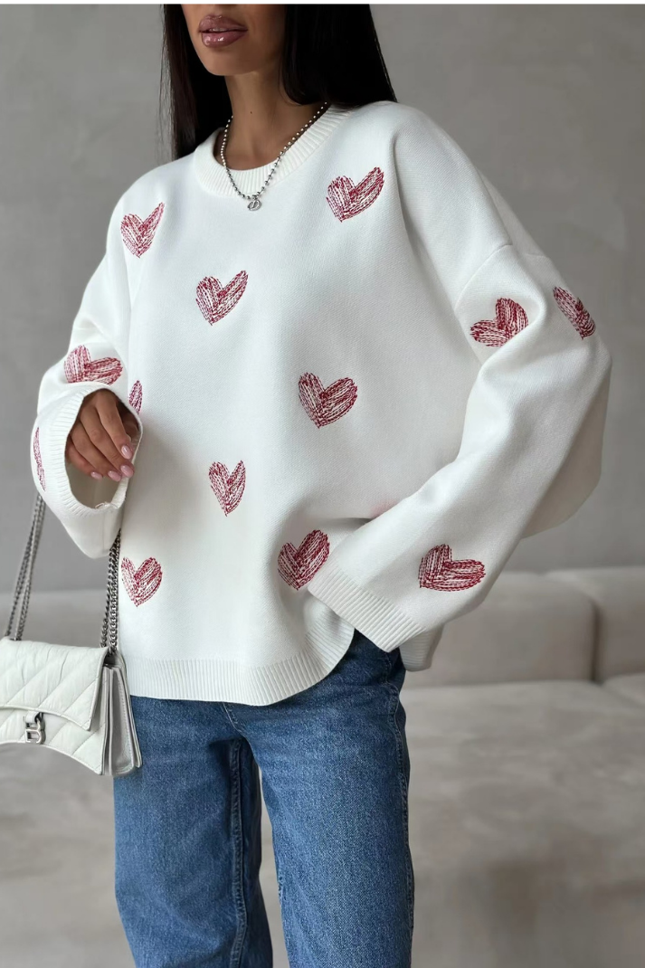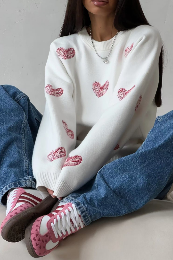 -Stil: Beyaz veya kırmızı kalp nakış işlemeli oversize kazak