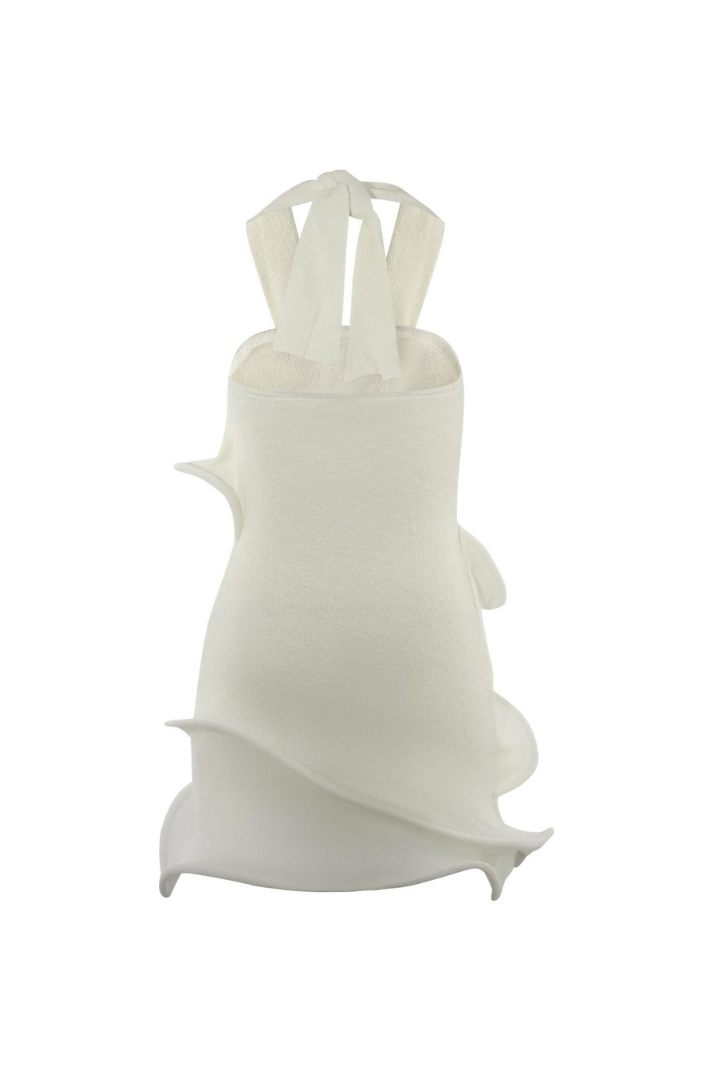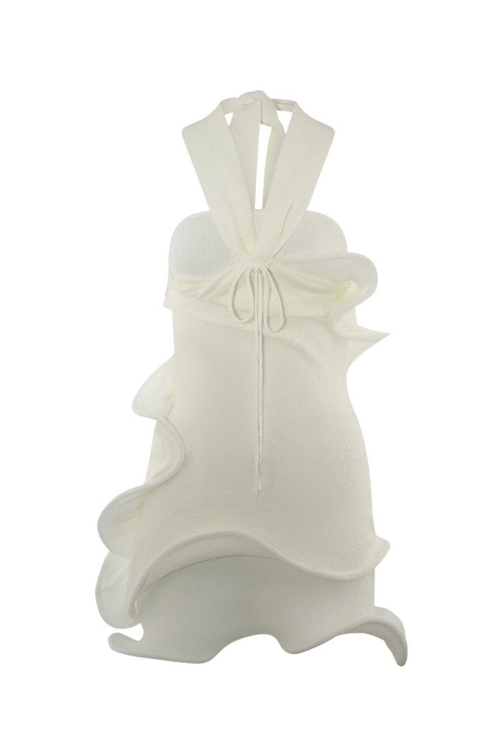 -Detaylar: Halter boyun bağlama, ön ve arkada dalgalı detaylar, dahili eşarp detaylı, astarsız, iç gösteren form, mini etek